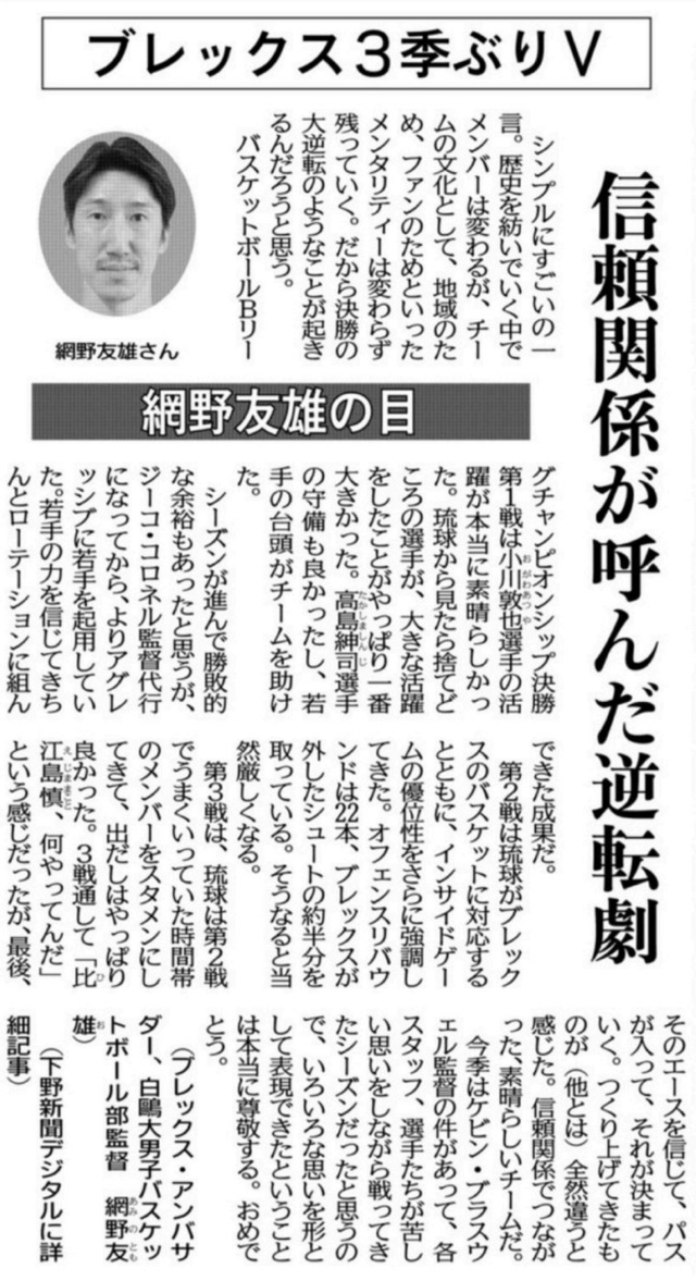 下野新聞デジタル「ブレックス勝利の要因、アンバサダー網野友雄さんに聞く