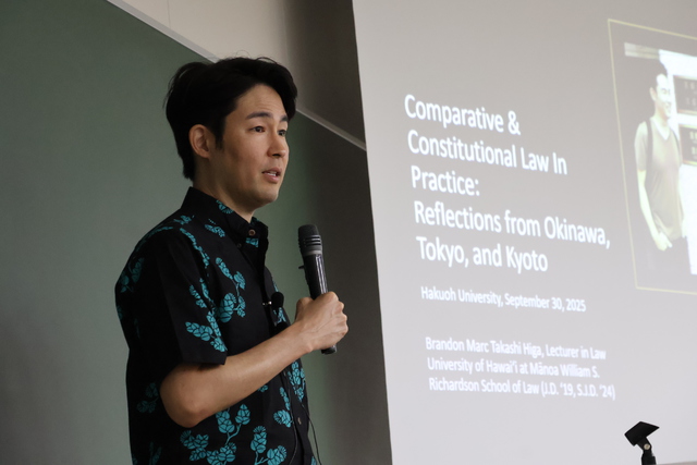 講師には、本学の海外協定校であるハワイ大学から、ブランドン・ヒガ先生(ハワイ大学リチャードソン・ロー・スクール講師/ハワイ大学カピオラニ・コミュニティ・カレッジ 大学内部質保証室ディレクター)とジョシュア・ファウムイナ先生(ハワイ大学リチャードソン・ロー・スクール法務博士候補)をお迎えし、「比較法と憲法を実践する:沖縄、東京、京都での経験から」というテーマでご講演いただきました。