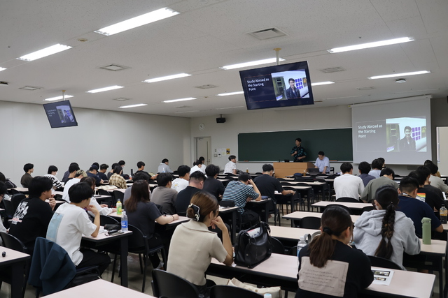 ヒガ先生の講演と楪教授の解説を受ける学生達の様子