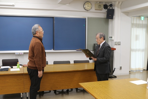 内田雄三教育学部長(右)から賞状を受け取る藤井教授