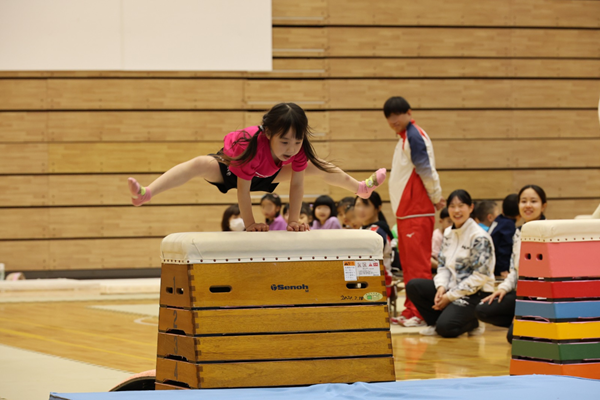 大会では、幼児から小学生までの子どもたちが、元気いっぱい・笑顔いっぱいの演技を披露してくれました。子どもたちの元気な挨拶や応援、最後までやり抜く姿勢など、会場全体で温かさが共有される大会となりました。今後も子どもたちのスポーツ参加機会の充実と、学生の実践的学びの深化を両立させながら、より良い大会づくりに取り組んでまいります。