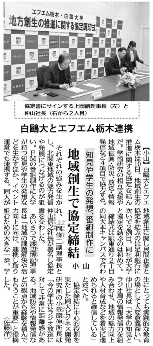 白鴎大学と株式会社エフエム栃木(本社:栃木県宇都宮市 / 代表取締役社長:仲山信之)は3月10日、「地方創生の推進に関する協定」を締結しました。