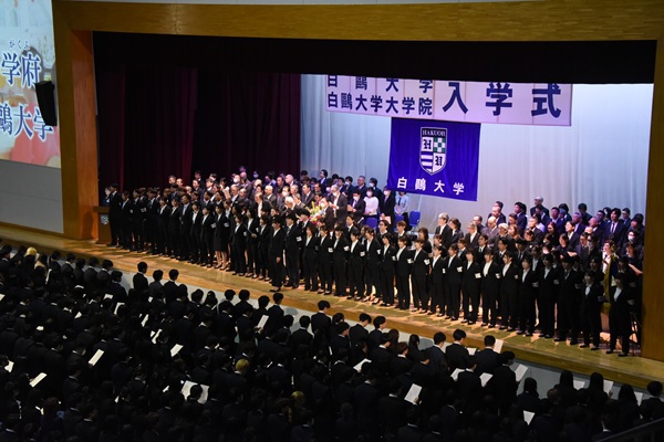 学生リーダーの先導のもと学歌を斉唱する新入生
