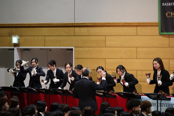 式典ではこのほか、ハワイ大学名誉総長のデイビット・ラズナー先生、北海道日本ハムファイターズCBOであり本学教員でもある栗山英樹先生からのビデオメッセージが披露されました。学生生活を支える教職員の紹介やハンドベル部による祝典演奏も行われ、式に華を添えました。最後は学生リーダーの先導のもと学歌を斉唱し、新たな門出を感じさせる空気の中、閉式となりました。