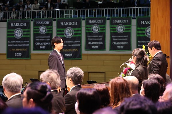 また、式典中には在学生表彰が行われ、第77回全日本大学選手権大会で優勝し優秀選手賞を受賞した男子バスケットボール部の内藤晴樹さん(教育学部4年)が功労賞を、日商簿記検定試験1級に合格した吉岡掌さん(法学部4年)が優秀賞をそれぞれ受賞し、新入生の前で紹介されました。