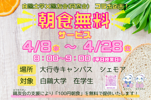在学生に向けた「朝食無料サービス」を4月8日から実施します。