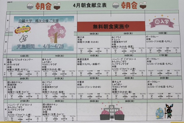 本学では年間を通じて授業日は100円で朝食を提供していますが、今回の無料サービスは本学同窓会「鴎友会」の支援を受けて期間限定で実施するものです。学生の経済的負担の軽減と、朝食をとる習慣づくりの促進を図ります。同サービスは1999年に試験的に開始し、学生から好評を得たことをきっかけに、2000年から毎年4月の恒例企画として定着しました。しかし、新型コロナウイルス感染症の影響により2020年・2021年は中止、2022年に再開後は実施を見送っていました。